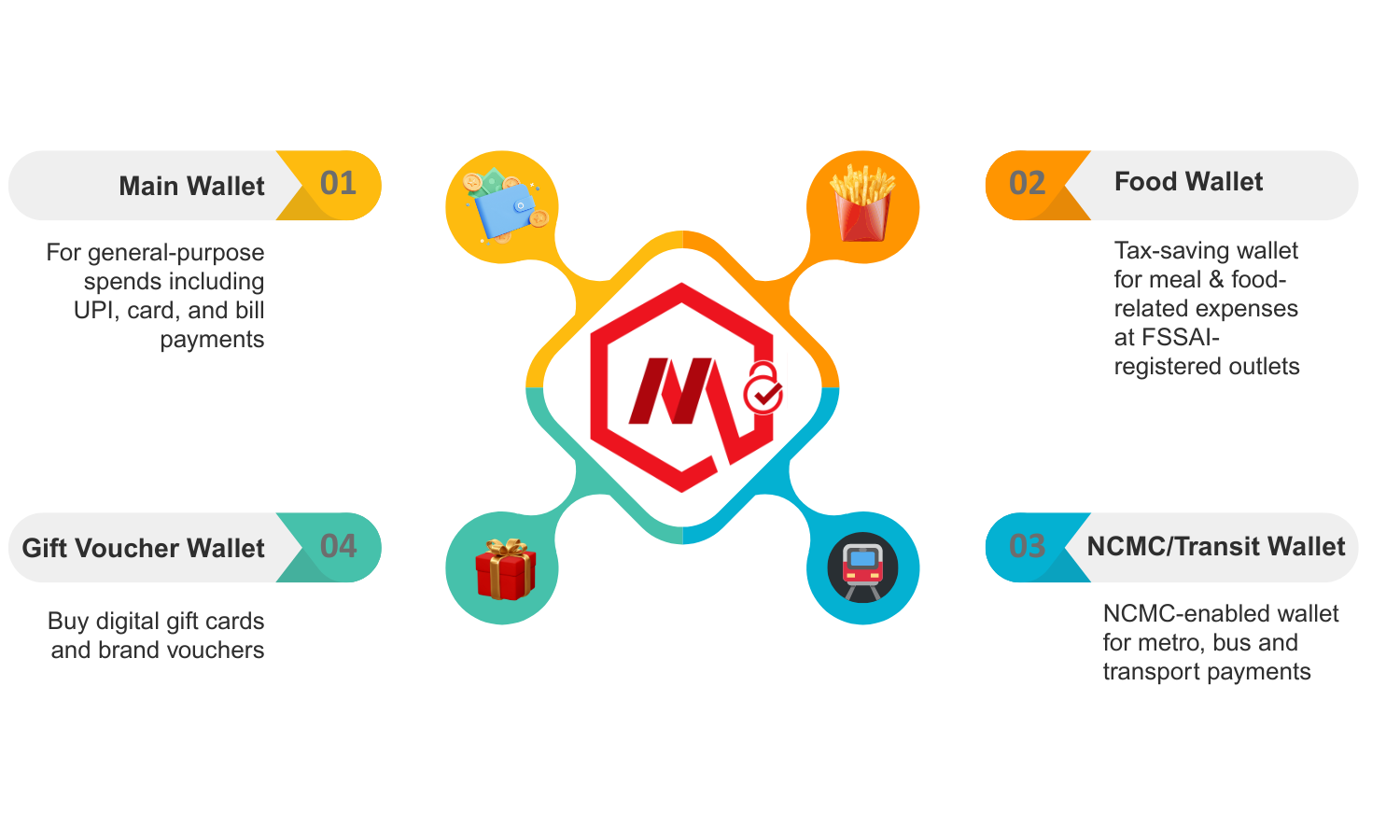 🔹 Main Wallet for UPI, card & bill payments 🍔 Food Wallet to save on meals at FSSAI-registered outlets 🚇 Transit Wallet powered by NCMC for metro & bus payments 🎁 Gift Voucher Wallet for brand vouchers & digital gifting